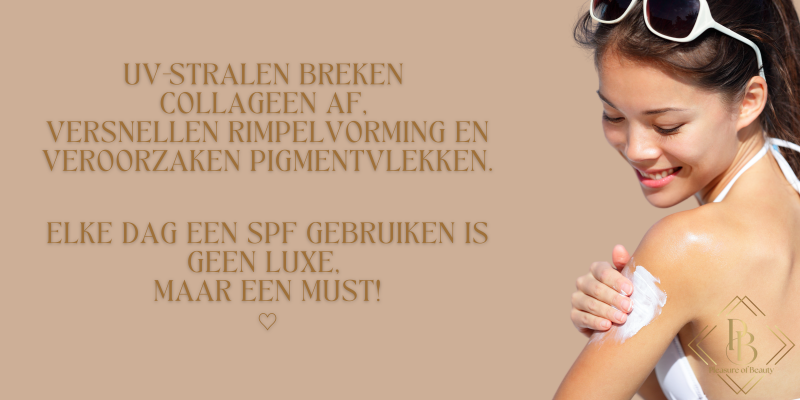 Zonlicht is heerlijk, maar verraderlijk voor je huid. UV-stralen breken collageen af, versnellen rimpelvorming en veroorzaken pigmentvlekken. Zonder bescherming veroudert je huid sneller – vaak zonder dat je het meteen ziet.